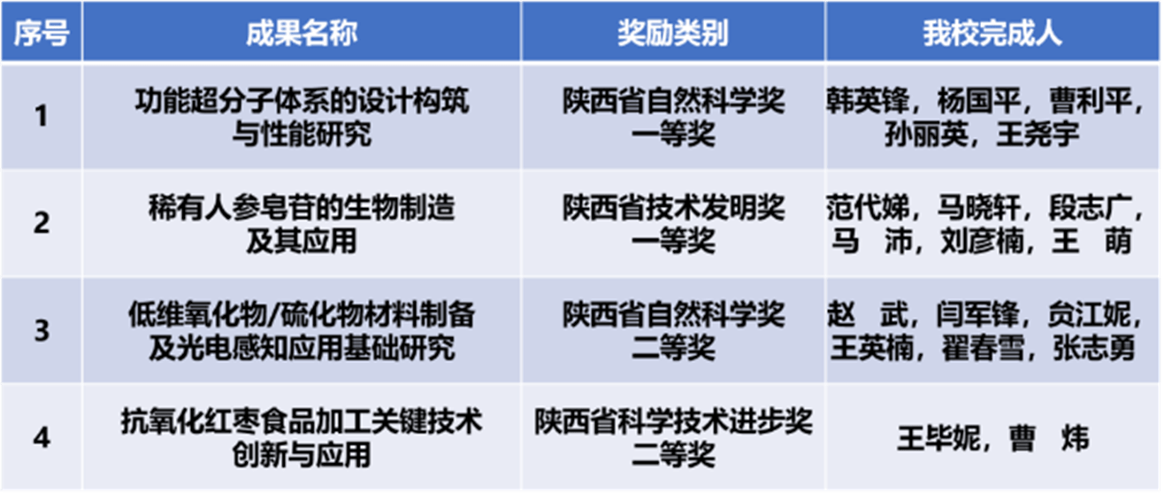 welcome欢迎光临威尼斯集团化材学院韩英锋教授主持的“功能超分子体系的设计构筑与性能研究”获省自然科学奖一等奖,化工学院范代娣教授主持的“稀有人参皂苷的生物制造及其应用”获省技术发明奖一等奖,信息学院赵武教授主持的“低维氧化物/硫化物材料制备及光电感知应用基础研究”获省自然科学奖二等奖,食品学院王毕妮教授主持的“抗氧化红枣食品加工关键技术创新与应用”获省科技进步奖二等奖。此外,welcome欢迎光临威尼斯集团参与的“秦岭主要珍稀野生动物抢救饲养繁育关键技术研究”和“陆相页岩油气地质工程一体化的负碳清洁开发技术”分别获得省科技进步奖二等奖。