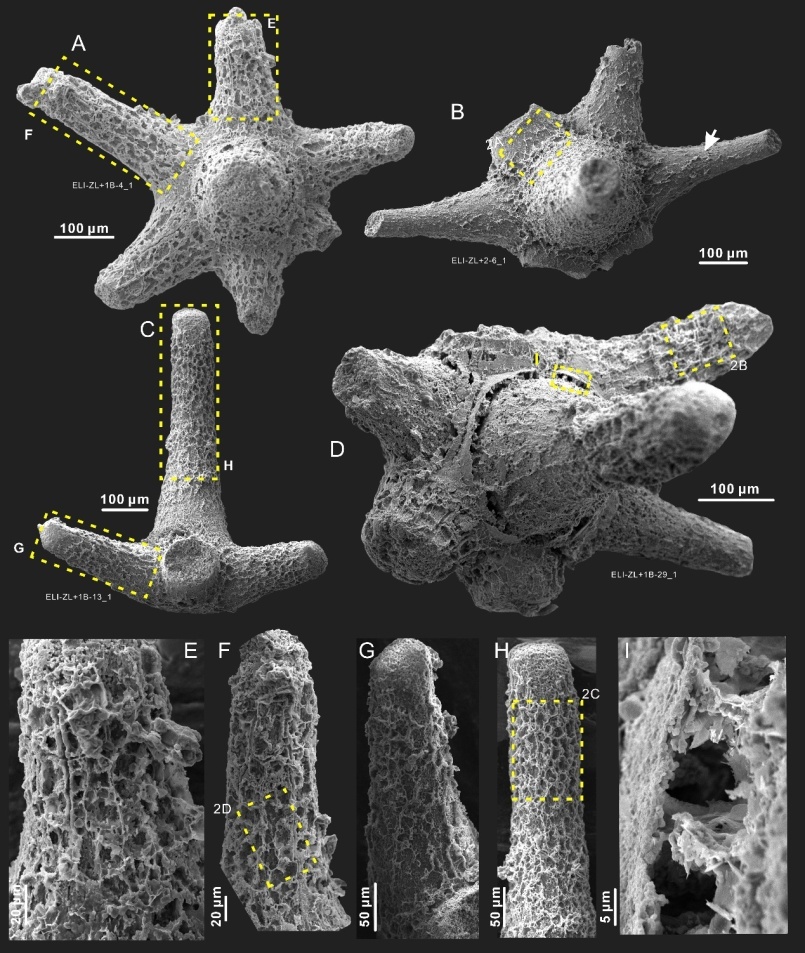 团队针对这些大小仅300μm的微小开腔骨骨片展开深入研究,通过扫描电镜、显微CT、聚焦离子束与扫描电镜联用(FIB-SEM)及透射电子显微镜能谱分析(TEM-EDS)等技术,发现骨片上存在大量以黏土矿物保存的多边形结构,如同“蜂巢”般包覆整个骨片。