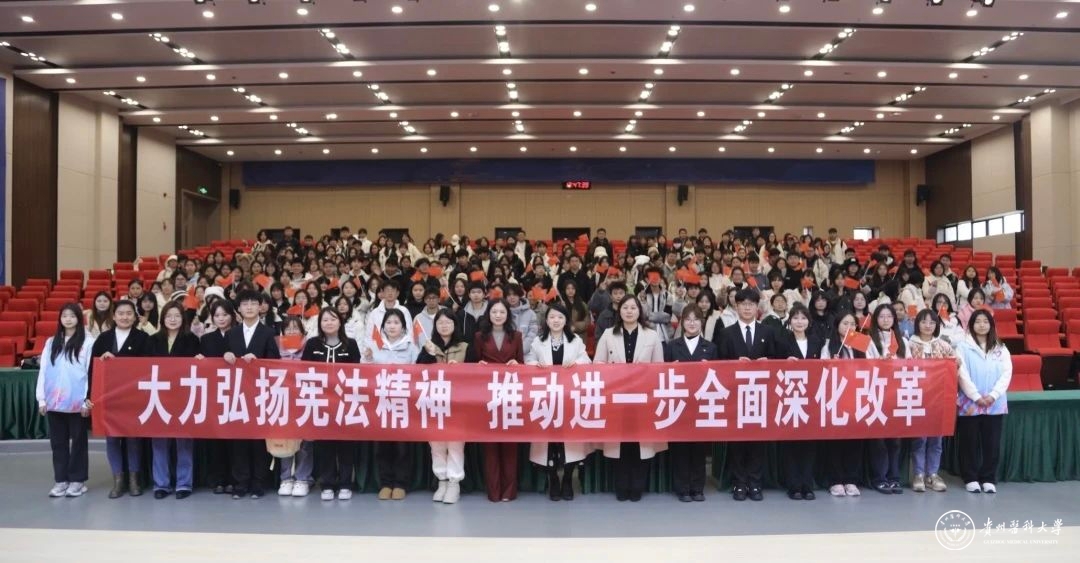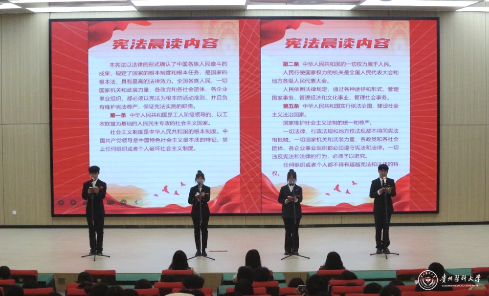 “中华人民共和国公民在行使自由和权利的时候,不得损害国家的、社会的、集体的利益和其他公民的合法的自由和权利。”医学人文学院学生代表带领全体参会师生开展宪法晨读,诵读《中华人民共和国宪法》部分条款,在场每一位贵医学子在潜移默化中,增强了自身对宪法的认同感与归属感,厚植知法学法、爱党爱国的情怀。