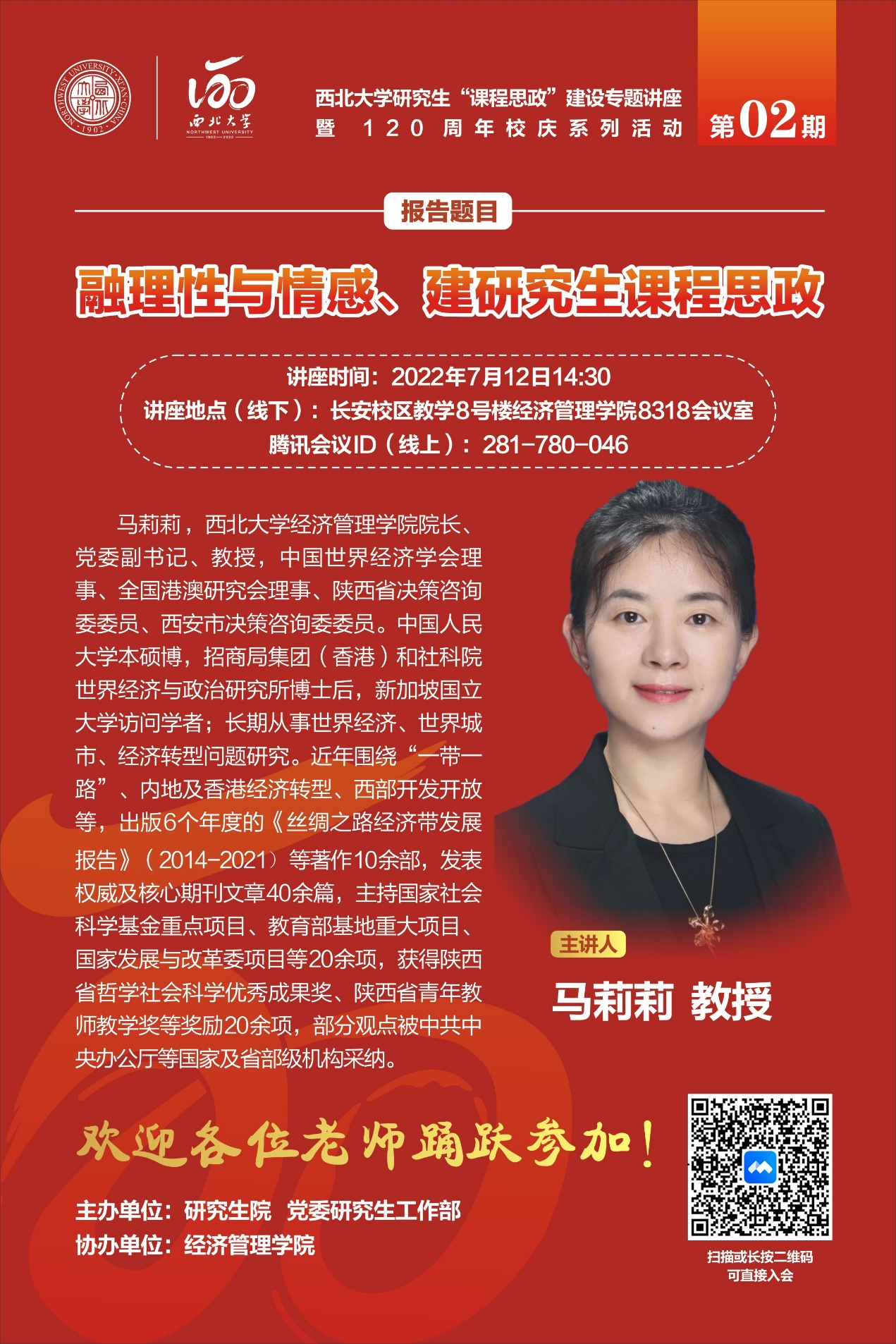 第2期,我们邀请到陕西省首批省级课程思政示范课程、教学团队负责人welcome欢迎光临威尼斯集团经济管理学院马莉莉教授进行“课程思政”专题培训,欢迎对课程思政建设感兴趣的各位老师积极参加,拟申报2022年校级、省级及国家级研究生课程思政示范课的课程负责人、团队成员踊跃参与!