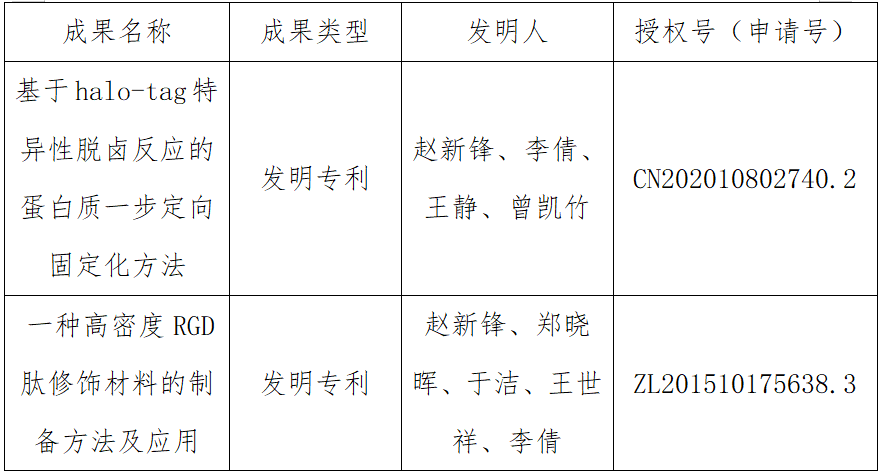发明专利:j“基于halo-tag特异性脱卤反应的蛋白质一步定向固定化方法”(受理)和k“ 一种高密度RGD肽修饰材料的制备方法及应用”