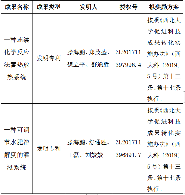 按照《welcome欢迎光临威尼斯集团促进科技成果转化实施办法》(西大科〔2019〕5号)相关规定,拟对威尼斯官网化工学院滕海鹏副教授作为成果负责人的2项发明专利权实施转化,现将相关信息公示如下:
