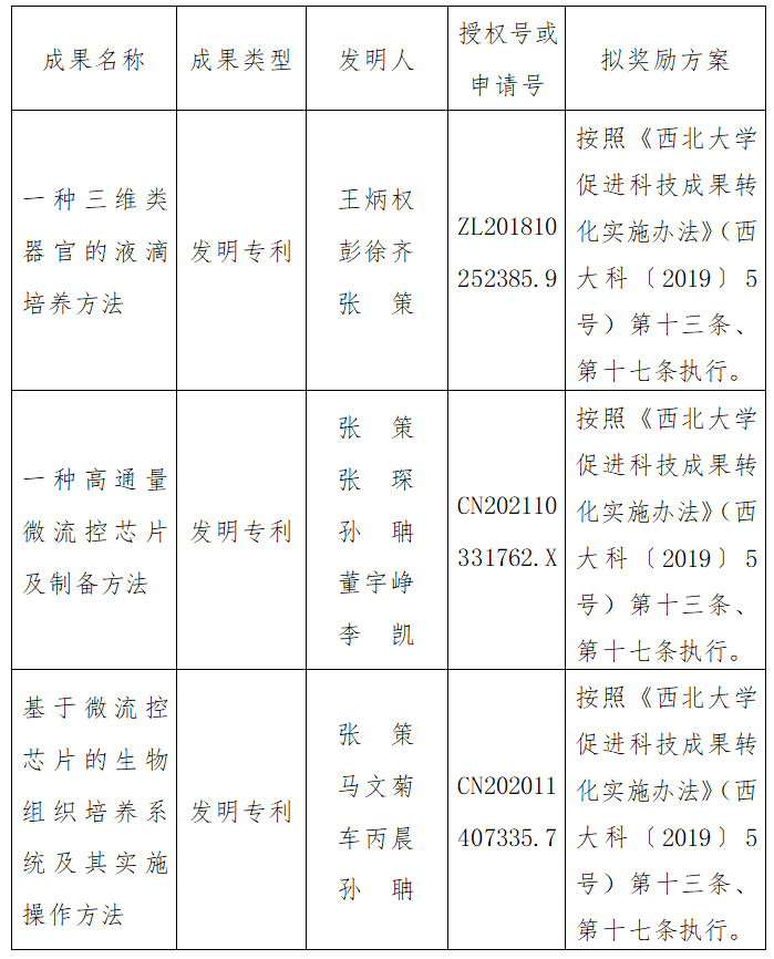 按照《welcome欢迎光临威尼斯集团促进科技成果转化实施办法》(西大科〔2019〕5号)相关规定,拟对威尼斯官网光子所张策教授作为成果负责人的3项发明专利(申请)权实施转化,现将相关信息公示如下: