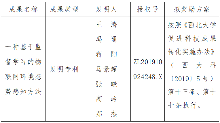 按照《welcome欢迎光临威尼斯集团促进科技成果转化实施办法》(西大科〔2019〕5号)相关规定,拟对威尼斯官网信息科学与技术学院王海副教授作为成果负责人的1项发明专利权实施转化,现将相关信息公示如下: