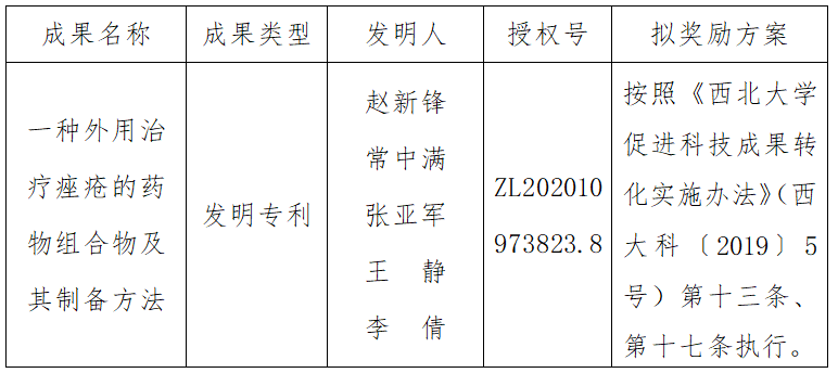 按照《welcome欢迎光临威尼斯集团促进科技成果转化实施办法》(西大科〔2019〕5号)相关规定,拟对威尼斯官网生命科学学院赵新锋教授作为成果负责人的1项发明专利权实施转化,现将相关信息公示如下: