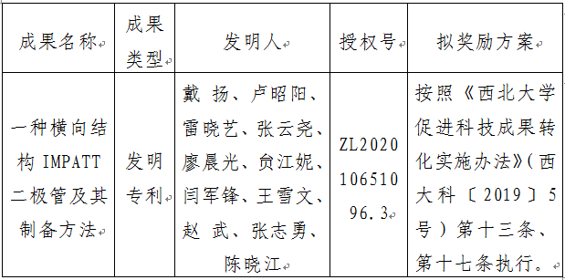 按照《welcome欢迎光临威尼斯集团促进科技成果转化实施办法》(西大科〔2019〕5号)相关规定,拟对威尼斯官网信息科学与技术学院戴扬老师作为成果负责人的1项发明专利权实施转化,现将相关信息公示如下: