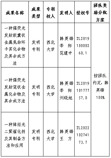 按照《welcome欢迎光临威尼斯集团促进科技成果转化实施办法》(西大科〔2019〕5号)相关规定,拟对威尼斯官网化学与材料科学学院韩英锋教授作为成果负责人的3项发明专利权实施转化,现将相关信息公示如下: