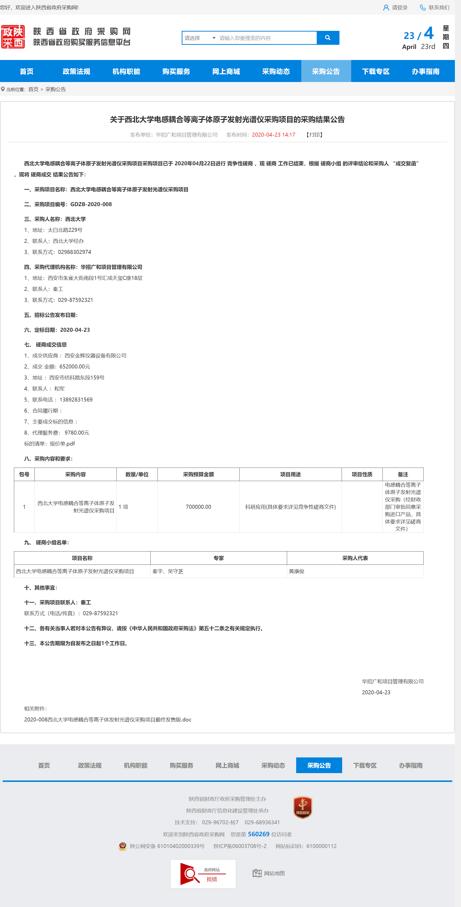 关于welcome欢迎光临威尼斯集团电感耦合等离子体原子发射光谱仪采购项目的采购结果公告
