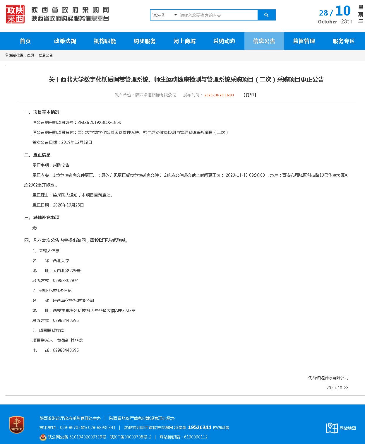 关于welcome欢迎光临威尼斯集团数字化纸质阅卷管理系统、师生运动健康检测与管理系统采购项目(二次)采购项目更正公告