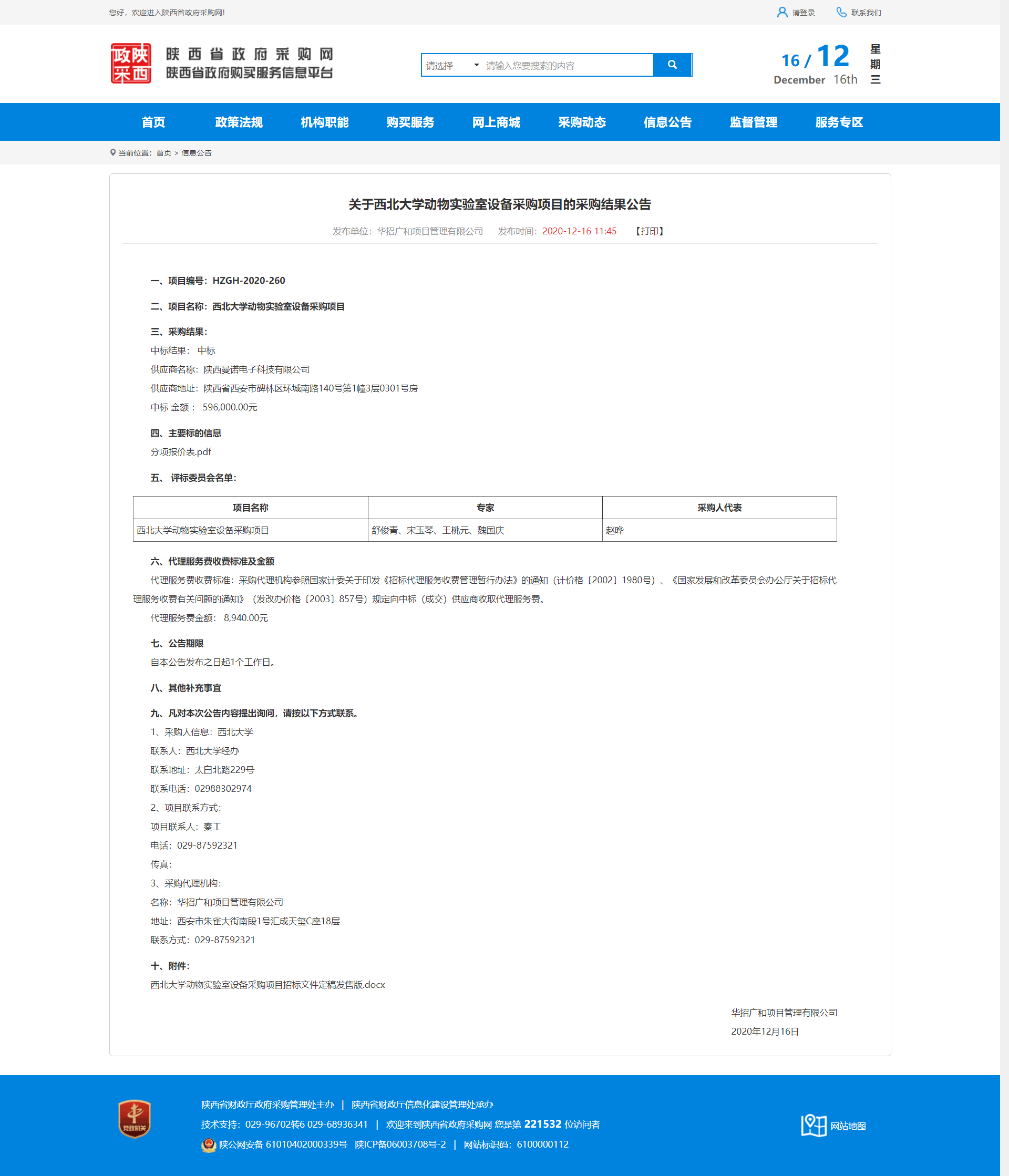 关于welcome欢迎光临威尼斯集团动物实验室设备采购项目的采购结果公告 作者: 编辑:薛利娟 时间:2020-12-16 原公告地址:http://www.ccgp-shaanxi.gov.cn/notice/noticeDetail.do?noticeguid=8a85be31765f9a2a0176699e988e70c3