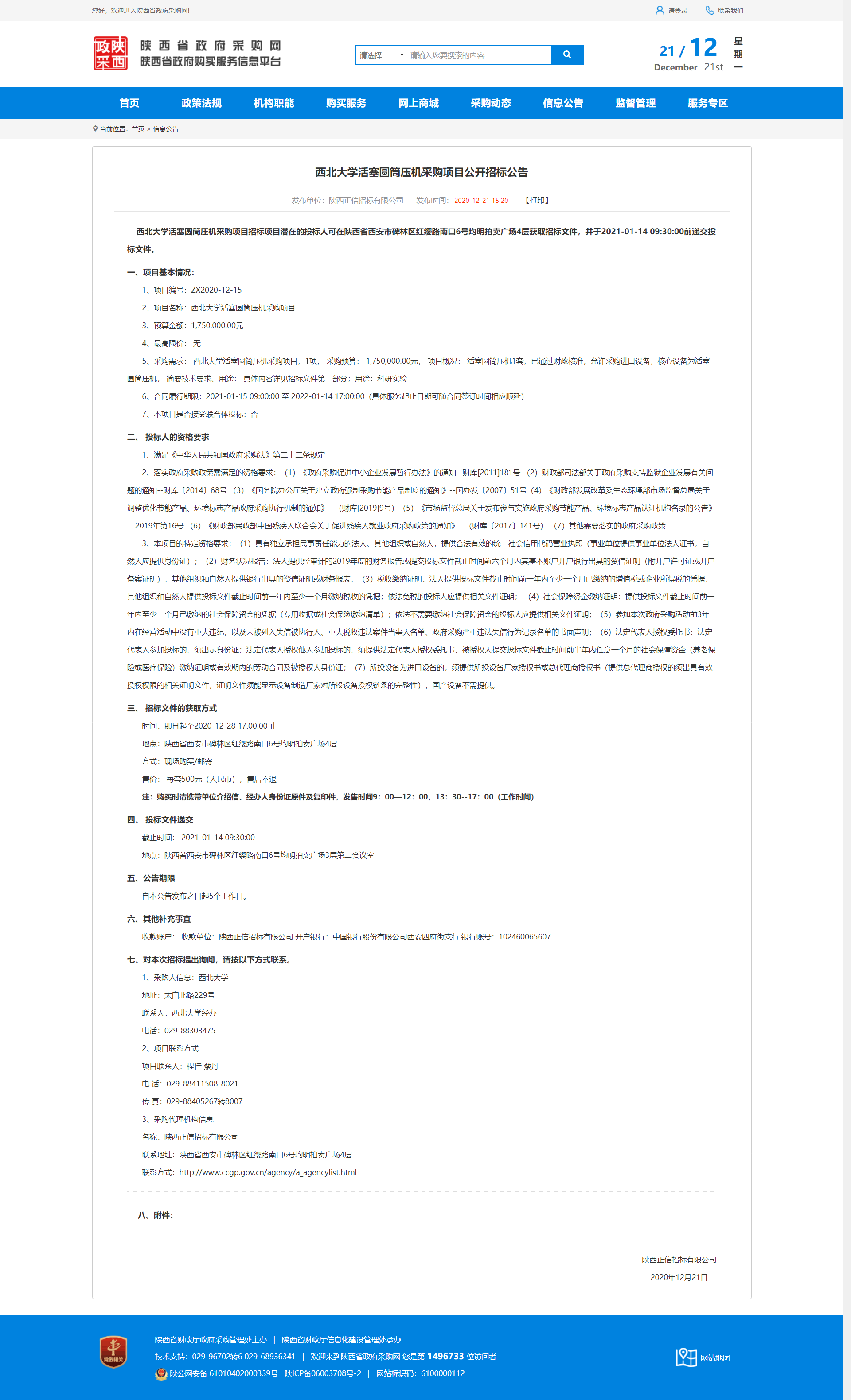 welcome欢迎光临威尼斯集团活塞圆筒压机采购项目公开招标公告 作者: 编辑:薛利娟 时间:2020-12-21 原公告地址:http://www.ccgp-shaanxi.gov.cn/notice/noticeDetail.do?noticeguid=8a85be33765f9dd0017683bb212e48f1