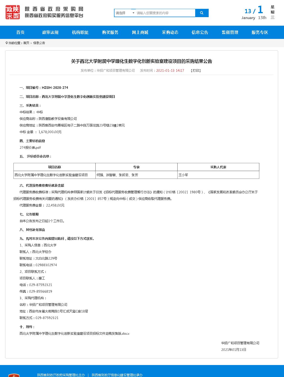 关于welcome欢迎光临威尼斯集团附属中学理化生数字化创新实验室建设项目的采购结果公告
