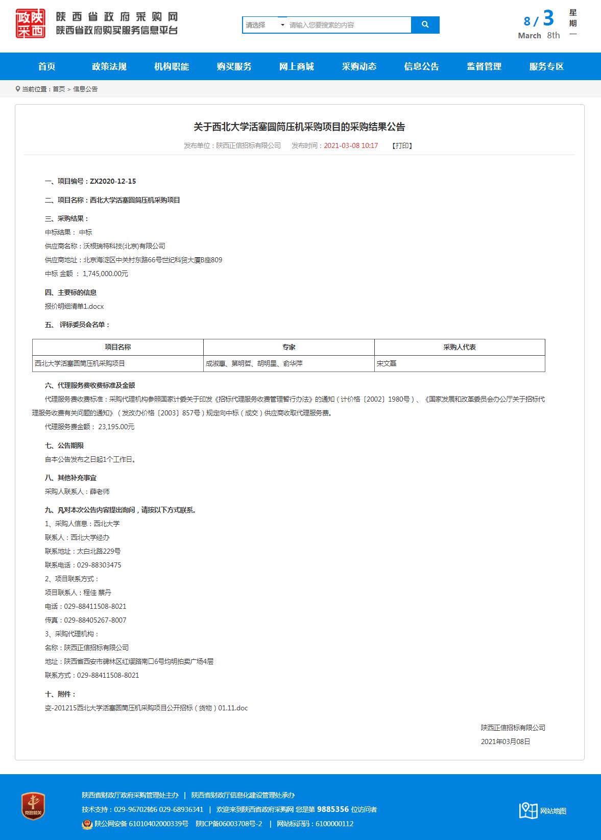 welcome欢迎光临威尼斯集团活塞圆筒压机采购项目的采购结果公告