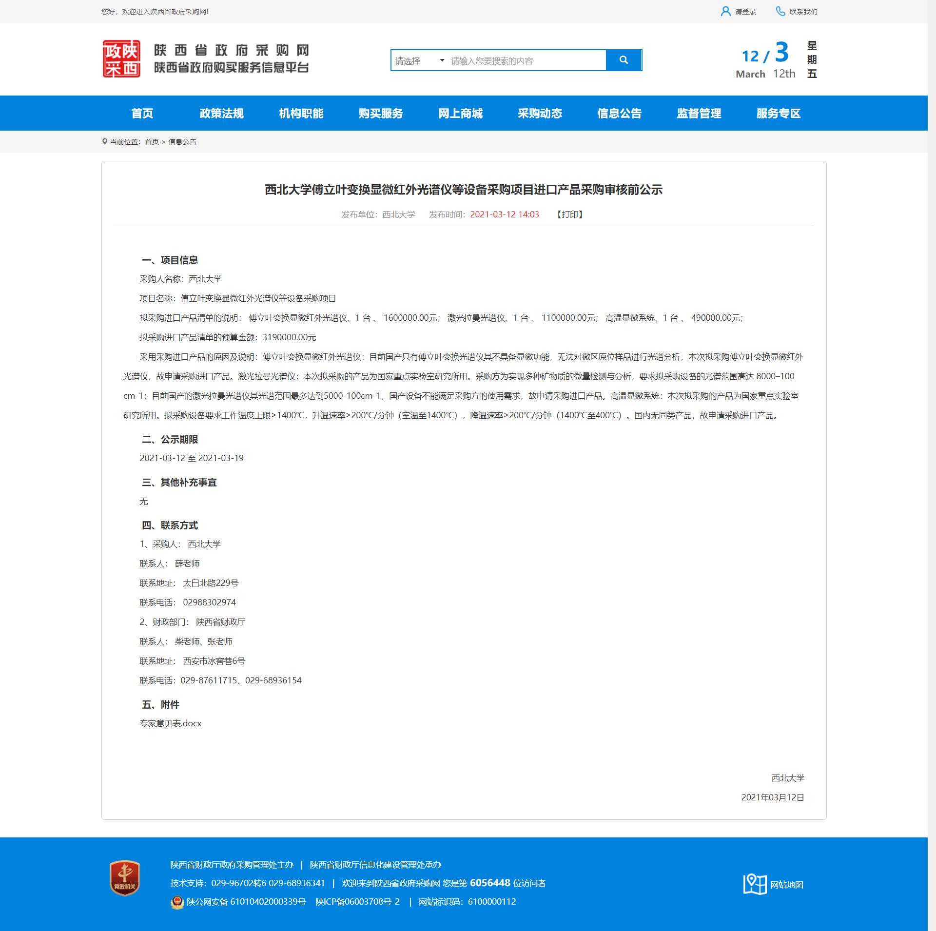 welcome欢迎光临威尼斯集团傅立叶变换显微红外光谱仪等设备采购项目进口产品采购审核前公示 作者: 编辑:薛利娟 时间:2021-03-12 原公告地址:http://www.ccgp-shaanxi.gov.cn/notice/noticeDetail.do?noticeguid=8a85be3377b2eca3017823fb30ad533f