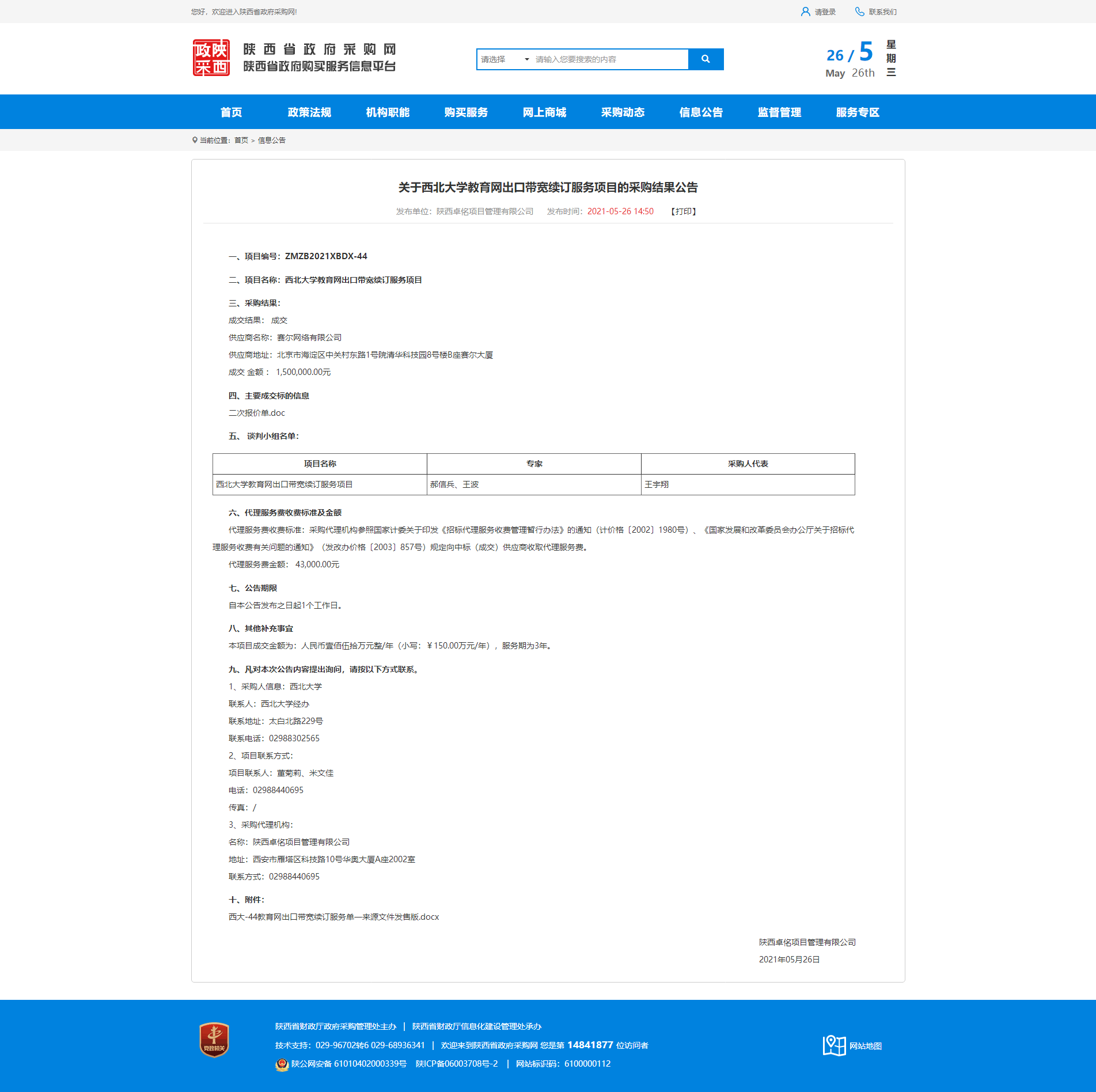 关于welcome欢迎光临威尼斯集团教育网出口带宽续订服务项目的采购结果公告