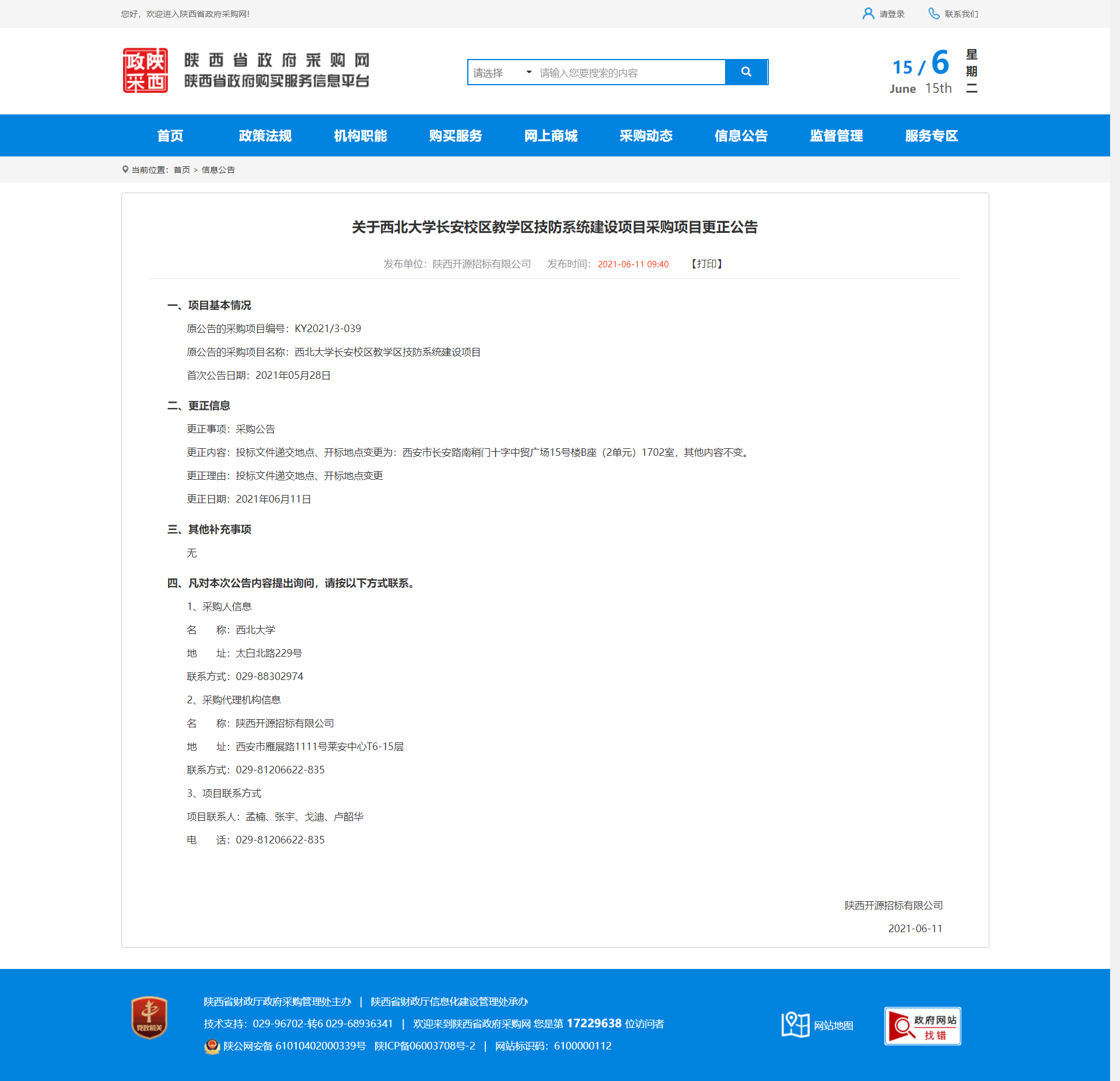 关于welcome欢迎光临威尼斯集团长安校区教学区技防系统建设项目采购项目更正公告 作者: 编辑:薛利娟 时间:2021-06-15 原公告地址:http://www.ccgp-shaanxi.gov.cn/notice/noticeDetail.do?noticeguid=8a85be33791baa0f0179f8ab30151d42