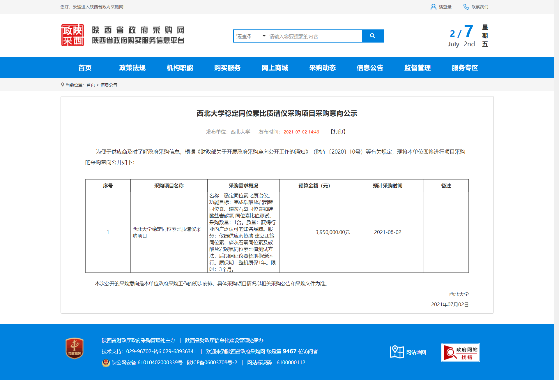 welcome欢迎光临威尼斯集团稳定同位素比质谱仪采购项目采购意向公示 作者: 编辑:采购与招标办公室 时间:2021-07-02 原公告地址:http://www.ccgp-shaanxi.gov.cn/notice/noticeDetail.do?noticeguid=8a85be317a51dcbc017a65e4a5e21daf