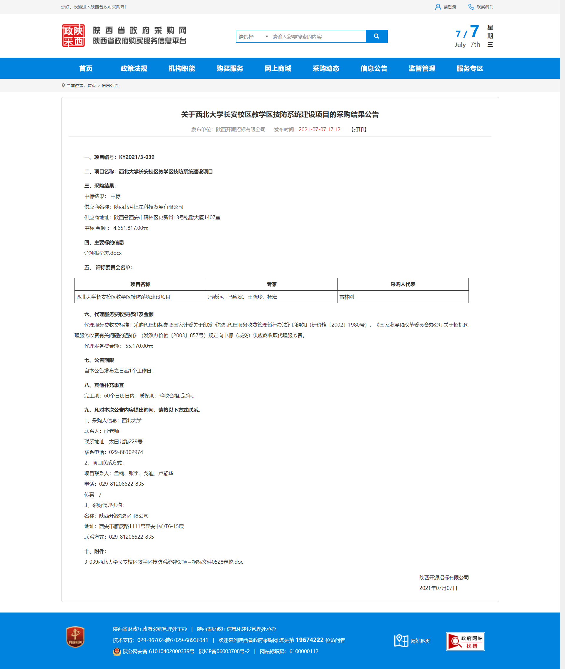 关于welcome欢迎光临威尼斯集团长安校区教学区技防系统建设项目的采购结果公告 作者: 编辑:采购与招标办公室 时间:2021-07-07 原公告地址:http://www.ccgp-shaanxi.gov.cn/notice/noticeDetail.do?noticeguid=8a85be337a79620e017a7fff10cb41ef