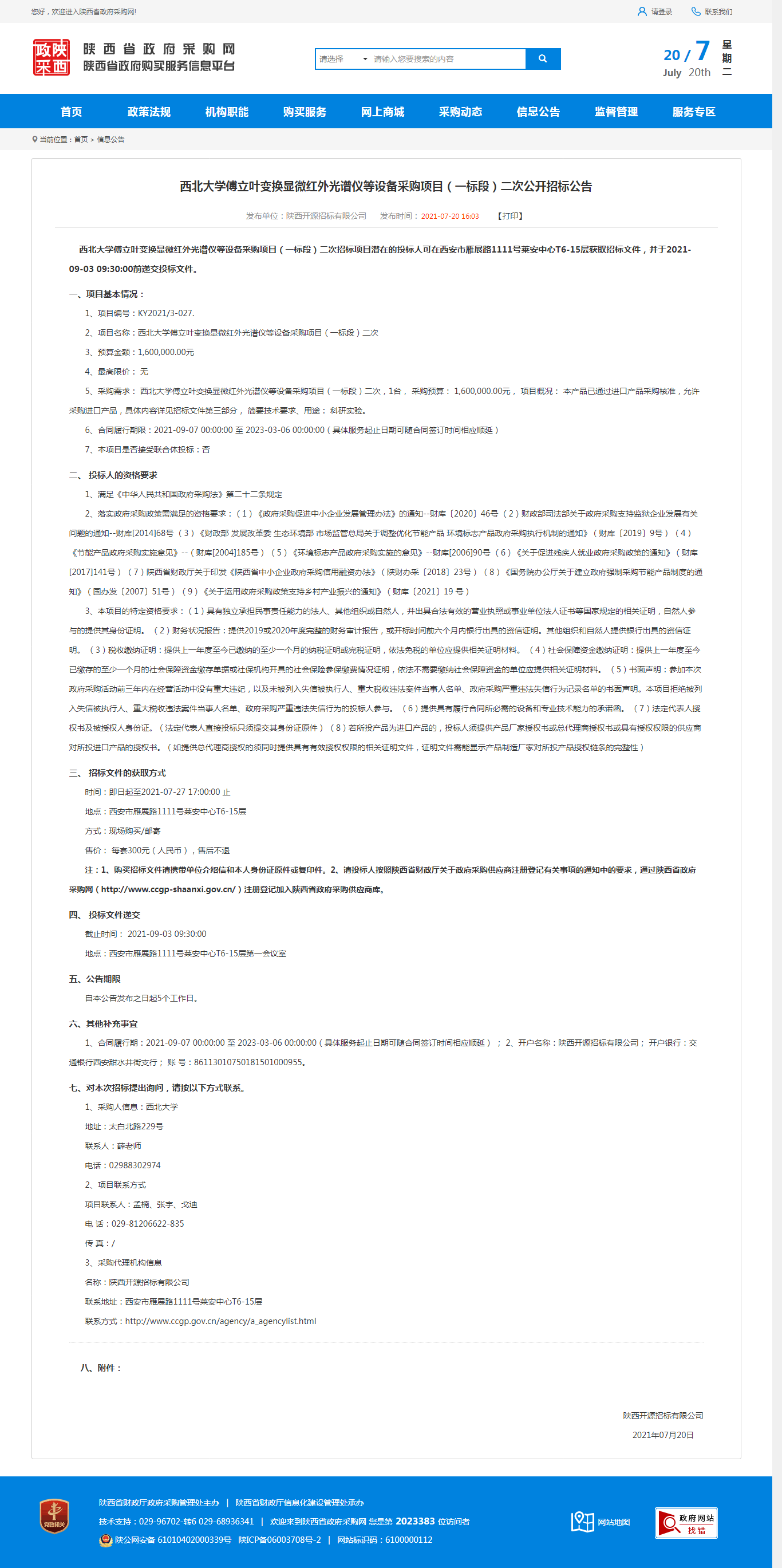 welcome欢迎光临威尼斯集团傅立叶变换显微红外光谱仪等设备采购项目(一标段)二次公开招标公告 作者: 编辑:采购与招标办公室 时间:2021-07-20 原公告地址:http://www.ccgp-shaanxi.gov.cn/notice/noticeDetail.do?noticeguid=8a85be337a79620e017ac245c8027b46