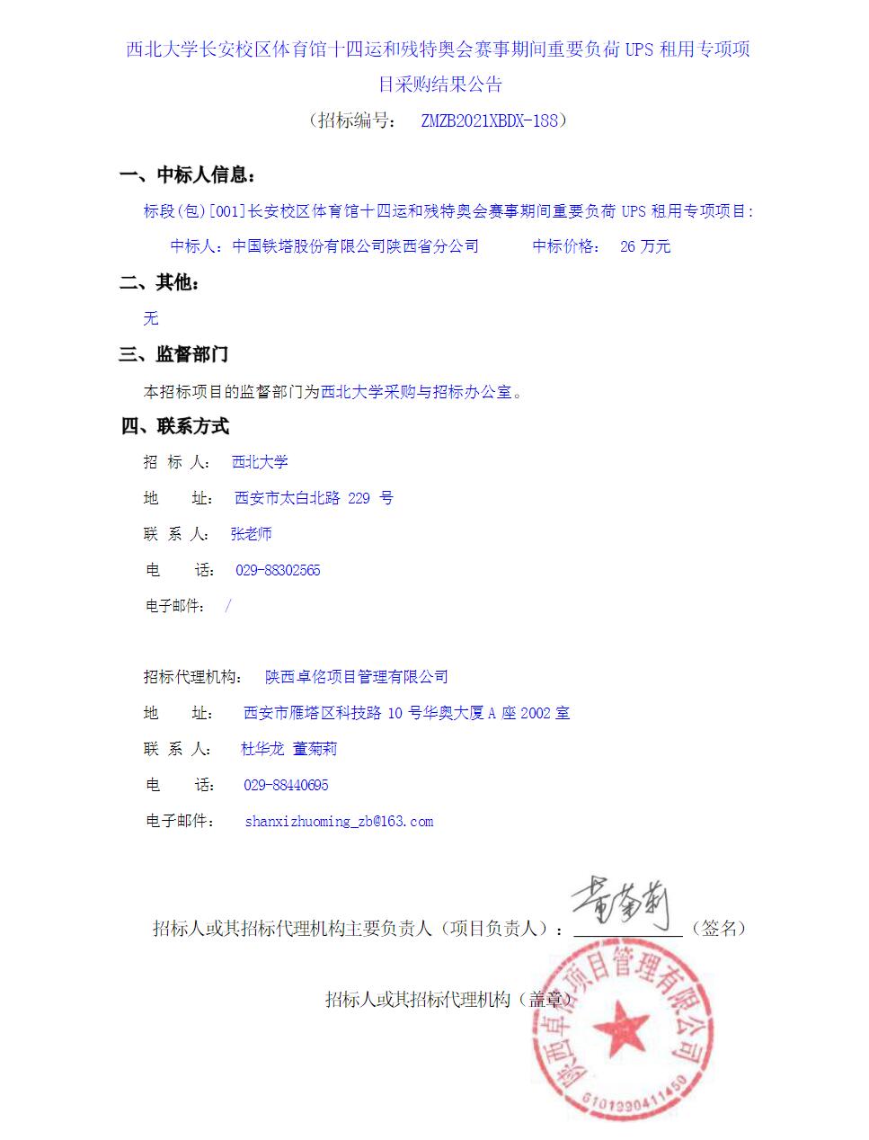 关于welcome欢迎光临威尼斯集团长安校区体育馆十四运和残特奥会赛事期间重要负荷UPS租用专项项目采购结果公告