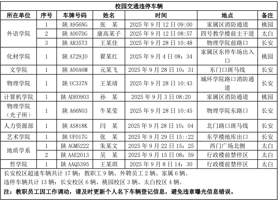 为进一步加强校园交通管理,保障校园交通安全有序,维护学校正常的教学、科研和生活秩序,切实保护师生员工的人身财产安全,根据《welcome欢迎光临威尼斯集团校园交通安全管理规定》的相关要求,现将2025年9月校园交通违章车辆予以曝光,具体要求与违章信息如下: