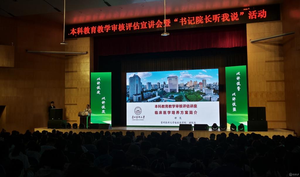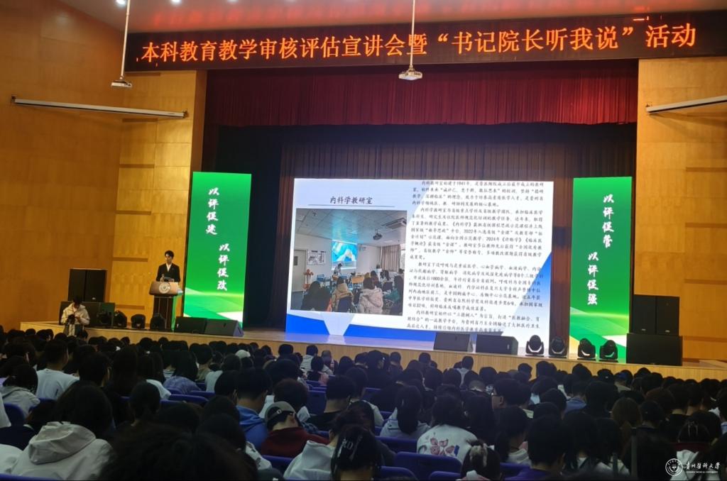 5月6日,临床医学院在北校区礼堂举办本科教育教学审核评估宣讲会暨“书记院长听我说”活动。附属医院党委书记、临床医学院党委书记李海洋,副校长曾柱,附属医院院长、临床医学院院长左石,校党委委员、党委宣传部部长、党委统战部部长陈颖,附属医院相关领导、相关职能部门负责人,学校党政办公室、学生处、医院管理处、校团委等部门负责人,医学影像学院、麻醉学院、医学检验学院负责人,以及临床医学院全体行政人员、辅导员、各教研室负责人、教学秘书、教师代表,临床医学院2022 级全体学生共计1100余人参加。