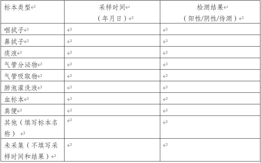 (四)标本采集与检测。收治病例的医疗机构要采集病例的相关临床标本,通知当地指定的标本运输机构尽快将标本送至当地指定的疾控机构或医疗机构或第三方检测机构实验室进行相关病原检测(见附件4)。