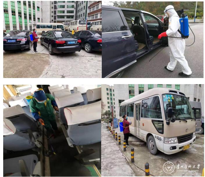 加派值班人员保障学校各部门及师生用车,及时对交通车及公务车辆进行消毒,做到一趟任务,一次消毒。要求驾驶员全部佩戴口罩,隔绝病毒传播途径,保障司乘人员卫生安全。