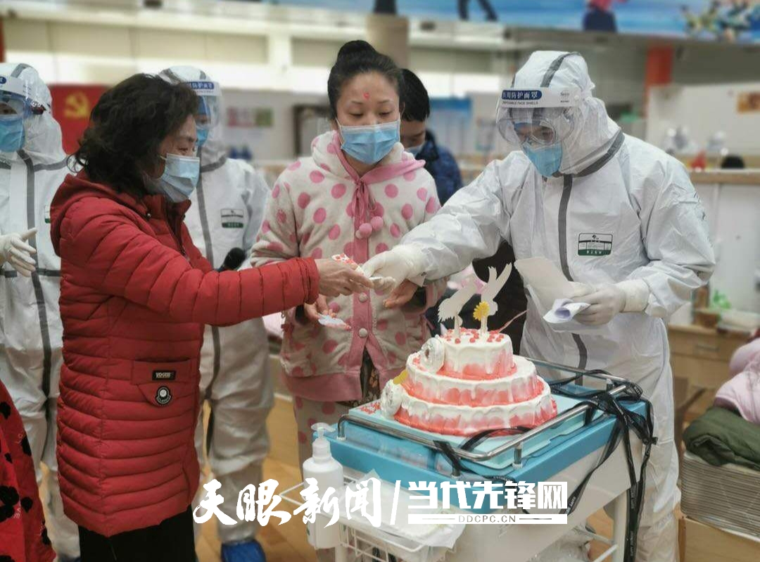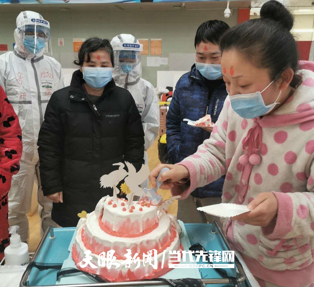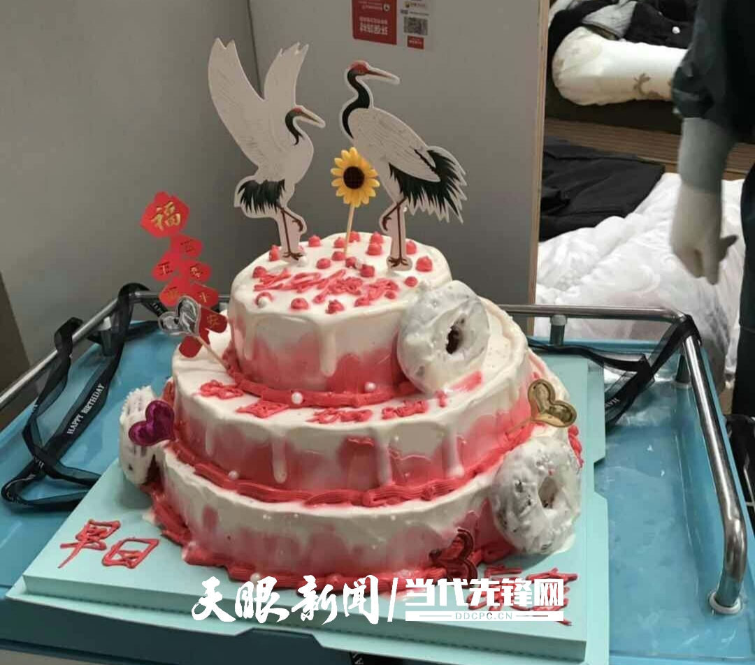 2月17日晚,一个三层粉色写着“早日康复”的生日蛋糕缓缓推入病区。3名过生日的患者在不知情的情况下被“点名”,现场医护人员和其他患者一同为他们献唱生日快乐歌。