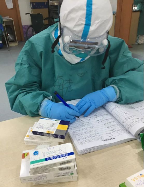 武汉汉口医院,中山大学附属第三医院内科ICU护士朱海秀在核对医嘱。