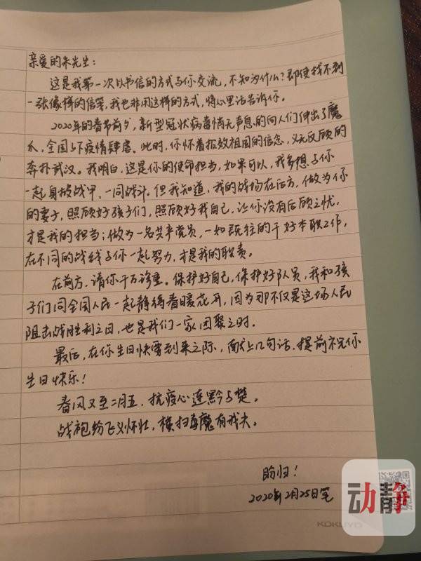 作为朱建国的妻子,自己也是第一次以“写信”这样的方式与在武汉前线的丈夫传递思念之情。“我多想与你一起身披战甲,一同战斗......”,但是作为妻子她选择了留在家里照顾好孩子,让丈夫没有后顾之忧。