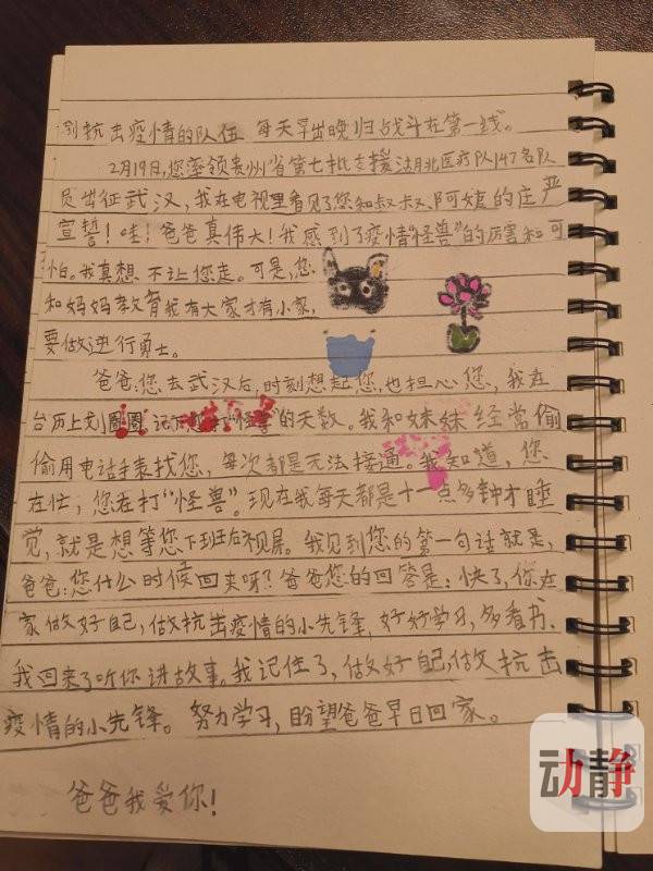 贵州省人民医院朱建国的两个女儿也在家期盼着爸爸早日“打败怪兽”,每天睡觉前都期盼着爸爸能够和自己视频,问问他,什么时候才能回家。姐姐每天都对着手机说:“爸爸,你要照顾好自己。我和妹妹等你平安回来!”