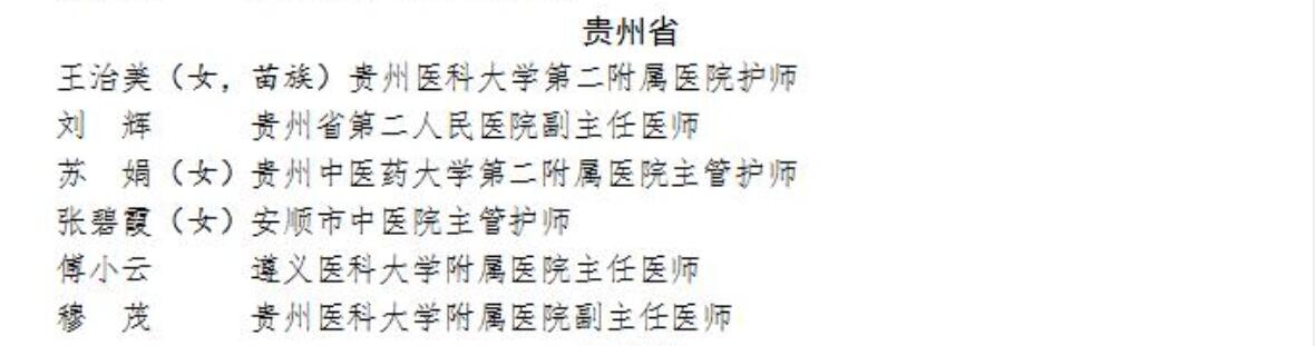 beat365在线唯一官网第二附属医院护师王治美、贵州省第二人民医院副主任医师刘辉、贵州中医药大学第二附属医院主管护师苏娟、安顺市中医院主管护师张碧霞、遵义医科大学附属医院主任医师傅小云、beat365在线唯一官网附属医院副主任医师穆茂获得全国卫生健康系统新冠肺炎疫情防控工作“先进个人”称号。