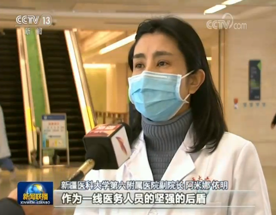 新疆医科大学第六附属医院副院长阿米娜·依明:作为一线医务人员的坚强的后盾,我们医院党委坚定坚决地落实好各项关心关爱措施,不管是孩子在上网课,还是老人在家里,我们都送物资上门,确保他们以最饱满的精神投入到一线的防疫工作当中。