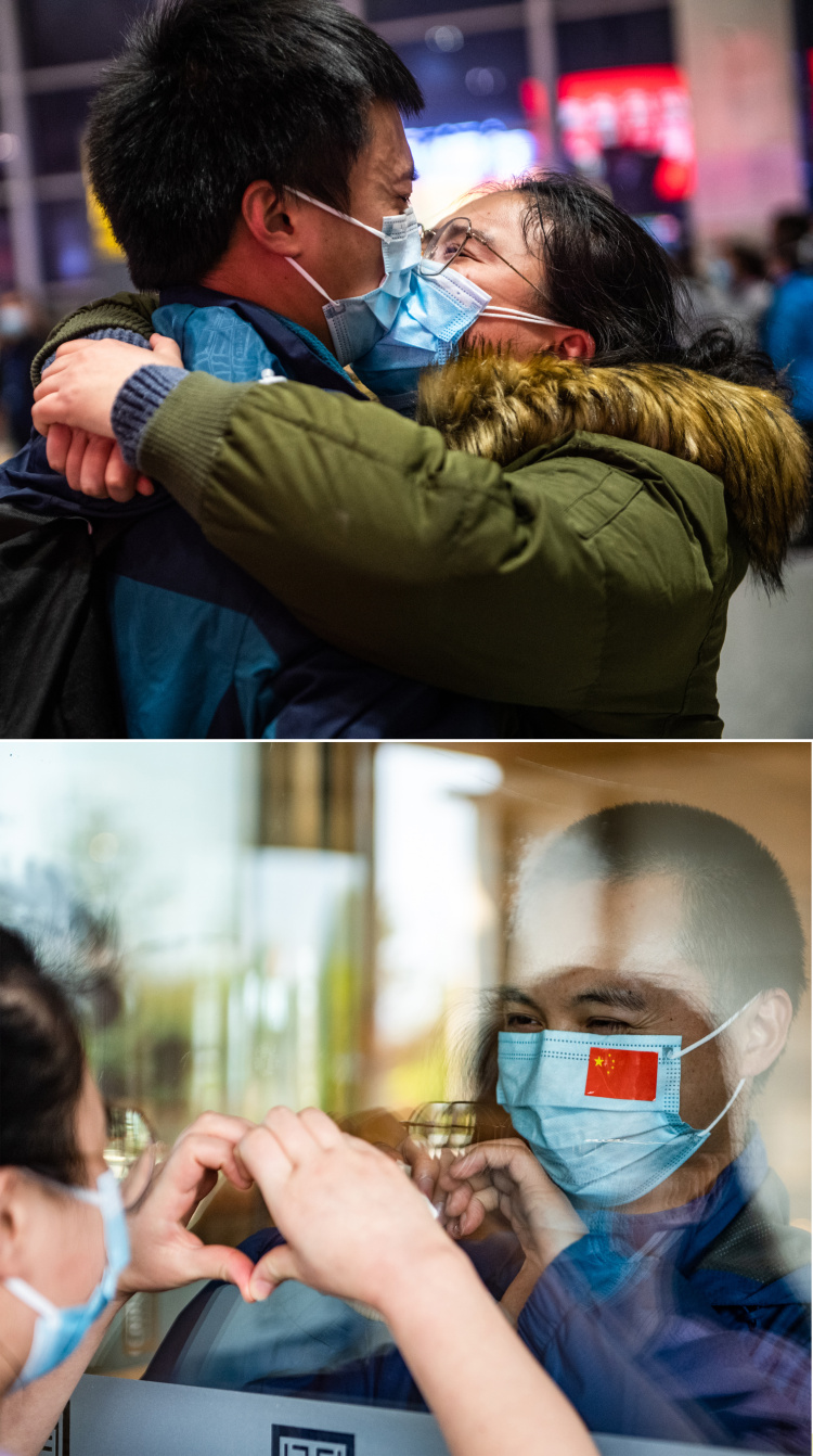 ↑这是一张拼版照片:上图为贵州援鄂医疗队队员黄秀峰出发前在机场和妻子章婷吻别(2月11日摄)下图为贵州援鄂医疗队队员黄秀峰返回后和妻子章婷在隔离酒店门口隔着玻璃比心(3月26日摄)