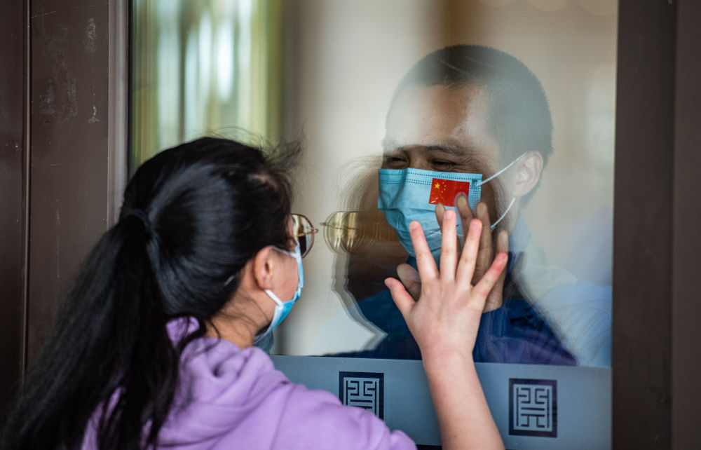下飞机后,黄秀峰和返回的其他医疗队员将统一在酒店隔离14天,夫妻俩只能隔空“见面”。在隔离酒店门口,章婷隔着酒店玻璃,和丈夫用手势“比心”,倾述彼此的思念。
