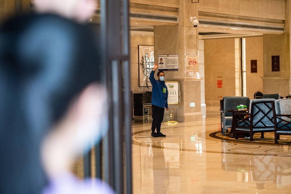 ↑在隔离酒店里的贵州援鄂医疗队队员黄秀峰与酒店外的妻子章婷打招呼(3月26日摄)