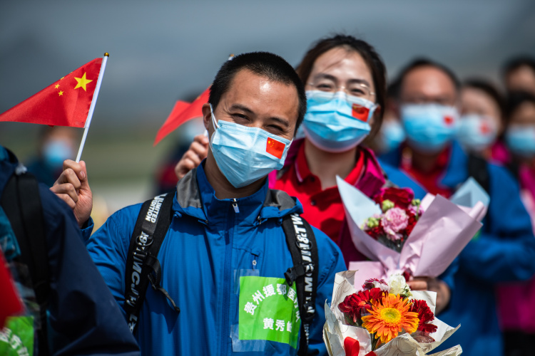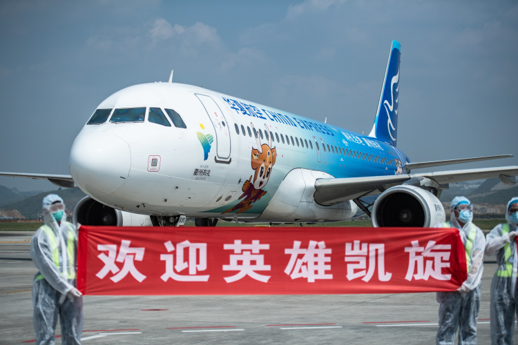 ↑贵州援鄂医疗队队员乘坐的飞机抵达贵阳龙洞堡机场(3月26日摄)