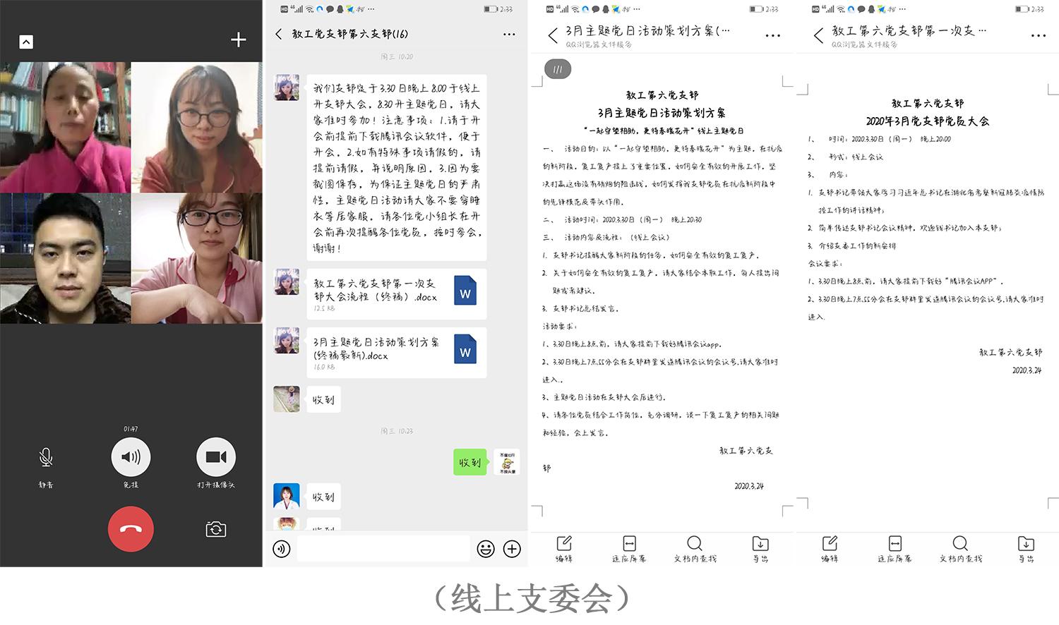 在抗疫关键时期,教工六支部坚持组织生活不断线,党员教育不停步,通过支部微信群,学习强国,在线视频会议等多种形式将“三会一课”制度常态化进行。组织党员学习疫情防控相关知识,教育党员引导身边群众学会辨别核实各类信息,抵制谣言散布,维护社会大局。3月23日,教工第六党支部召开线上支委会,传达了上级党委精神,制定3月份主题党日活动的方案,并讨论了近期支部工作安排以及党员发展相关事宜。