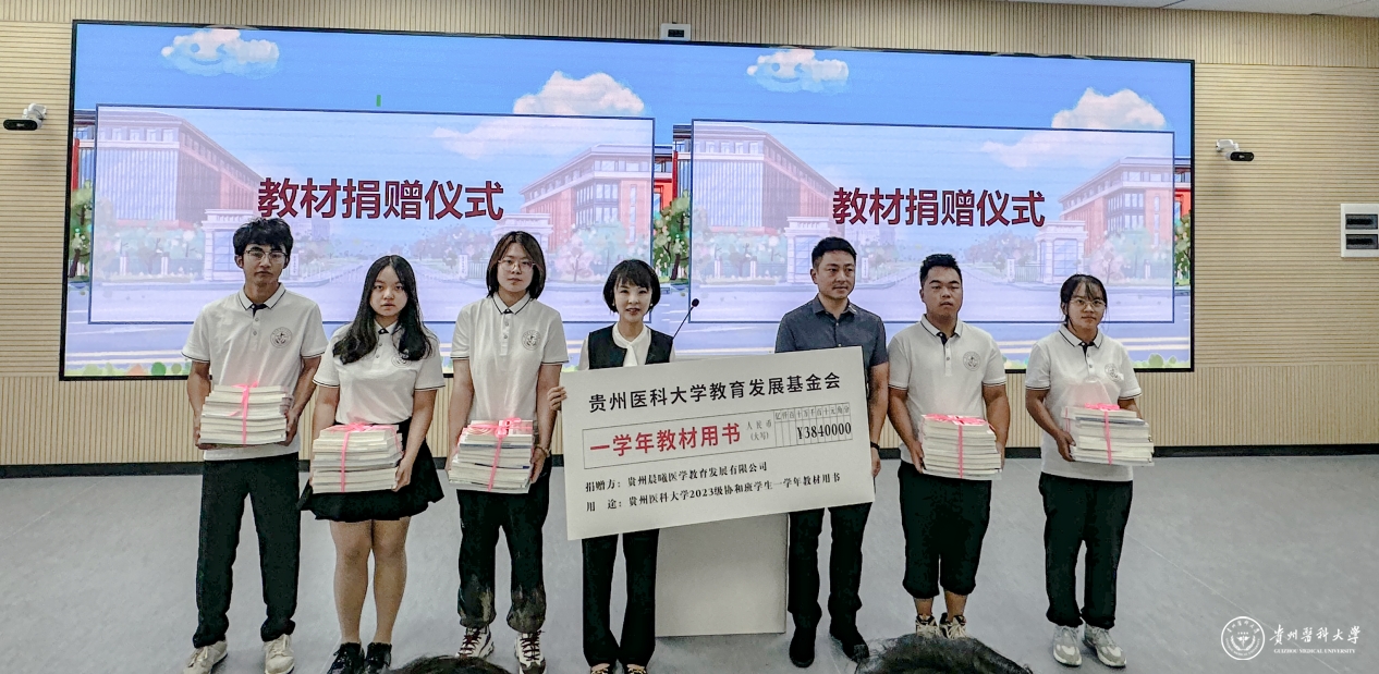 会后,贵州晨曦医学教育发展有限公司副总经理曾甑向2023级“协和班”同学捐赠教材。