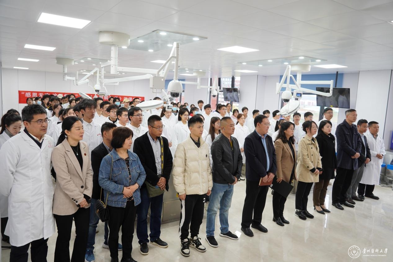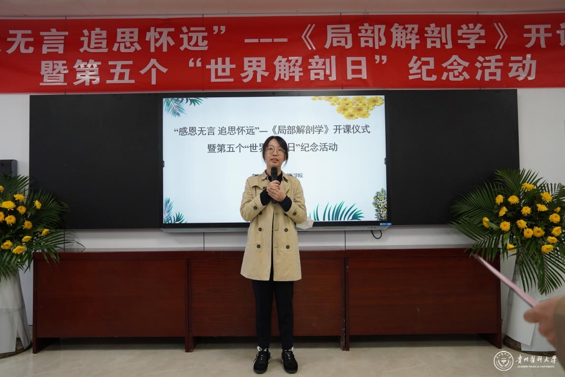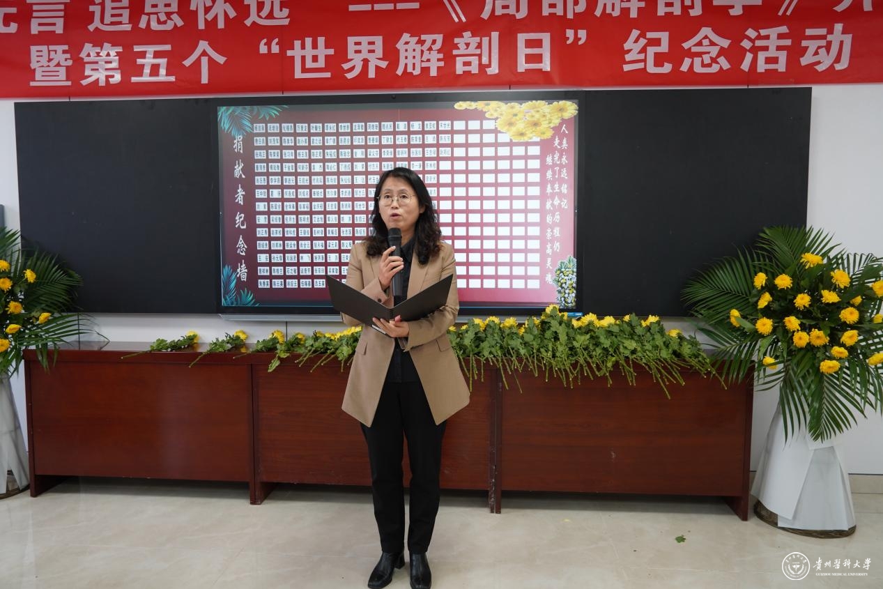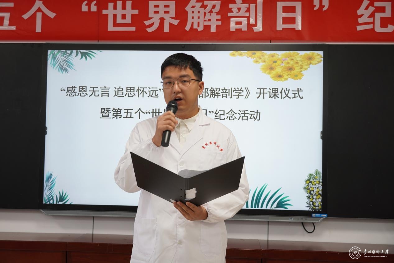 贵州省五一劳动奖章获得者、人体解剖学教研室罗时鹏老师宣读祭文以表达对捐献者的哀思。人体解剖学教学实验中心教师代表陈运华带领同学进行解剖誓词的宣誓。