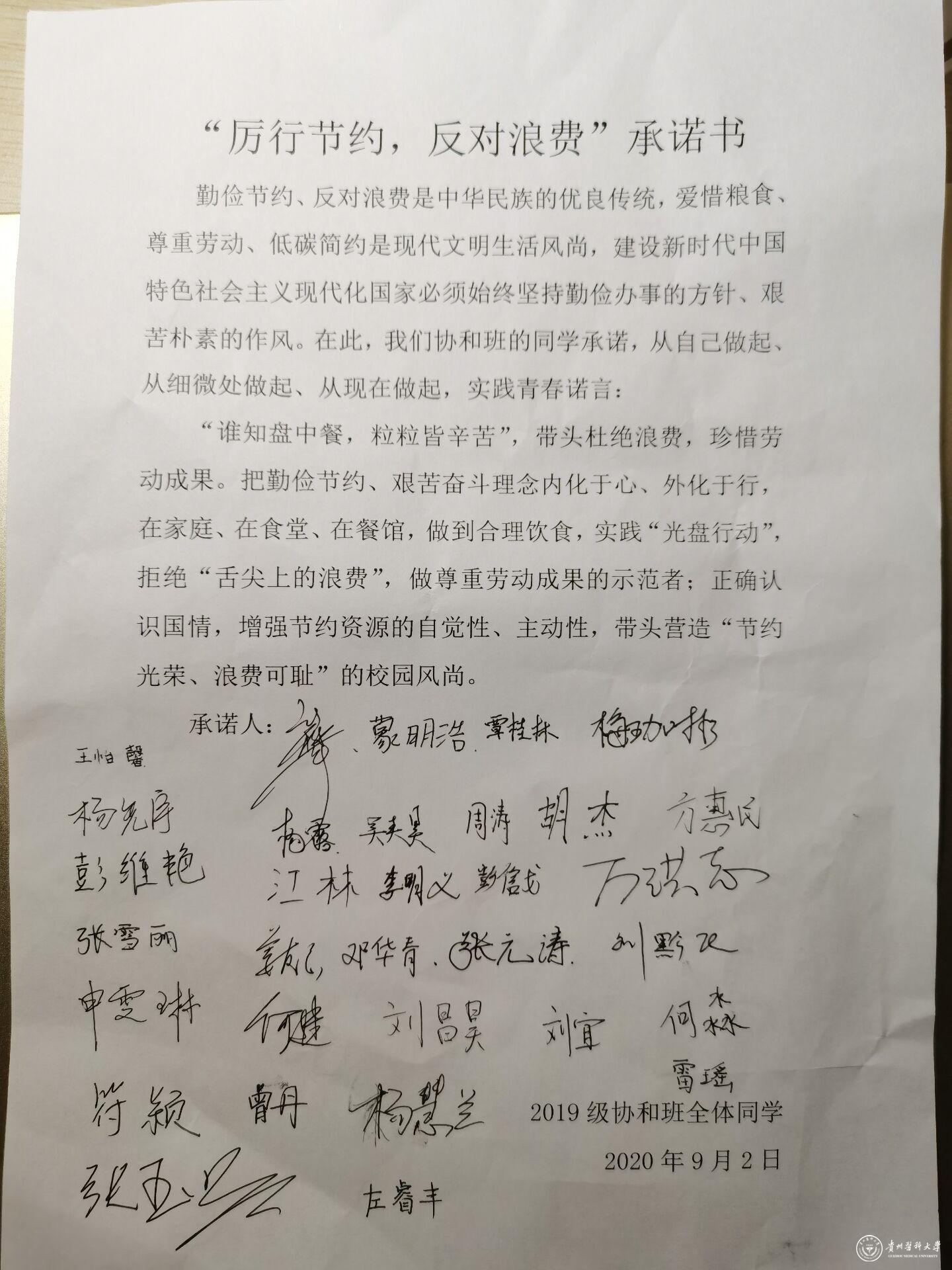 会后,协和班同学们表示,一定要在未来的学习生活中贯彻落实好习近平总书记的重要指示精神,厉行节约,反对浪费,珍惜粮食,并在承诺书上签上了自己的名字,大家共同互相监督,从小事做起,将节约行动贯穿到方方面面。