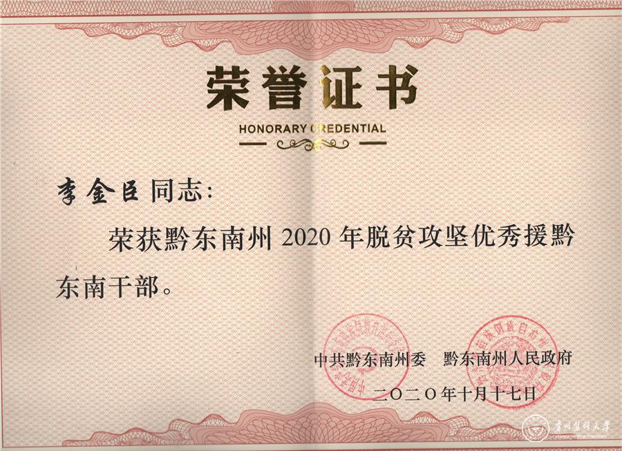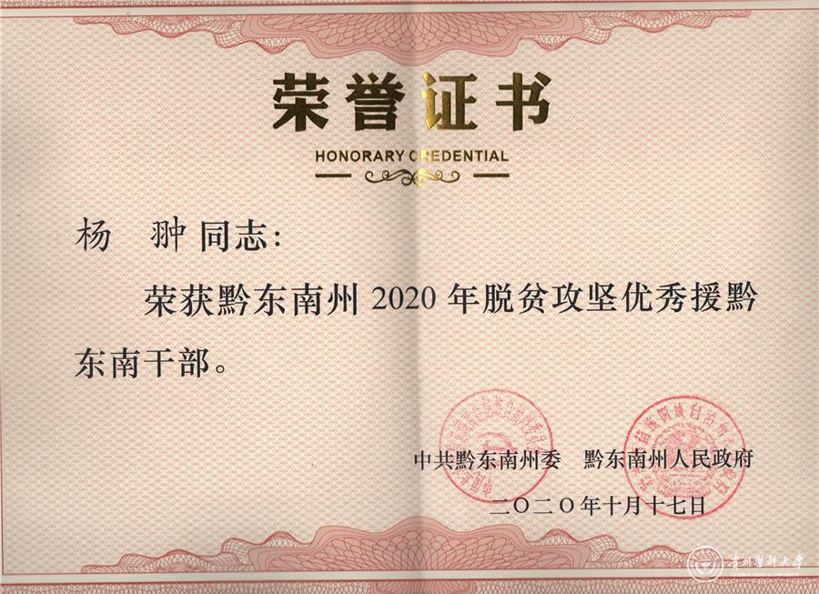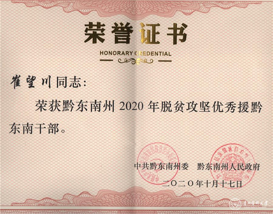在第七个国家扶贫日到来之际,黔东南州委州政府表彰了在全州2020年脱贫攻坚工作中做出突出贡献的先进个人,beat365驻村帮扶队员:运动与健康学院孟立科、保卫处李金臣、药学院杨翀、基础医学院肖朝伦、第二附属医院崔望川等五位同志荣获“黔东南州2020年脱贫攻坚优秀援黔东南干部”称号。