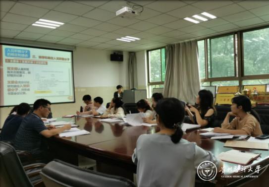 院党委书记周红传达学习《中国共产党beat365在线唯一官网第一次代表大会工作报告》,强调要紧紧围绕大会主题,高举中国特色社会主义伟大旗帜,坚持以习近平新时代中国特色社会主义思想为指导,团结带领广大教职医护员工生,统一思想、凝心聚力,攻坚克难、锐意进取,奋力谱写高水平医科大学建设新篇章。党委副书记肖绚就党支部标准化建设支部书记及支部委员职责进行了详细解读,让大家更明确自己的工作职责,明确权利与义务,更好地加强支部建设,正科级组织员付旎作“贵州省发展党员工作规程”培训,详细讲解了党员发展流程。
