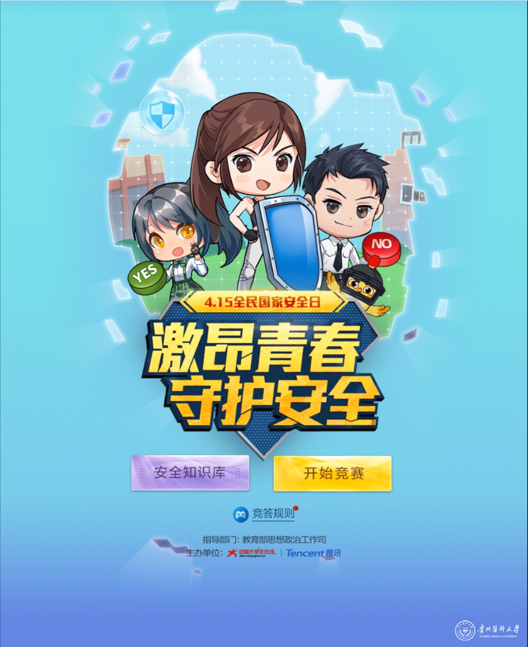 2021年4月15日是我国第六个全民国家安全教育日。为进一步普及国家安全知识,在教育部思想政治工作司指导下,中国大学生在线与腾讯公司共同举行“激昂青春·守护安全”全国高校学生国家安全知识线上竞答游戏活动。活动采用百人同屏竞技答题模式,并结合年轻人喜闻乐见的动漫IP形象,号召大家积极参与到国家安全知识学习中,不断提高安全意识,共筑国家安全防线。