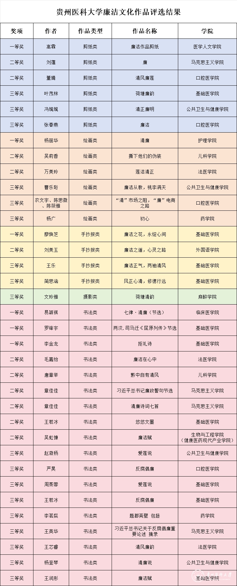 党委学生工作部(学生处、武装部)部(处)长王韬、校团委书记王妤煜、贵州省纪委省监委派驻校纪检监察组综合室副主任李丹、党委组织部副部长蔡炼、党委宣传部网络信息管理科科长陈祥贵对本次征集作品进行评审。经评委现场评选,综合考虑作品的主题内涵性、作品原创性以及艺术观赏性等要素,评选出35件获奖作品。