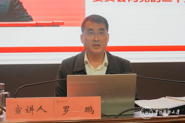 11月16日,校党委副书记、校长罗鹏在花溪校区道德讲堂专题宣讲党的二十大精神。罗鹏强调,党的二十大报告高屋建瓴、思想深邃、内涵丰富,是全面建设社会主义现代化国家、全面推进中华民族伟大复兴的总遵循、总定位、总航标,我们要以高度的责任感和历史使命感从党的二十大报告中找启迪、找思路、找答案,在解放思想中守正创新、在奋发图强中争创一流,将党的二十大精神认真贯彻落实到学校工作中来。