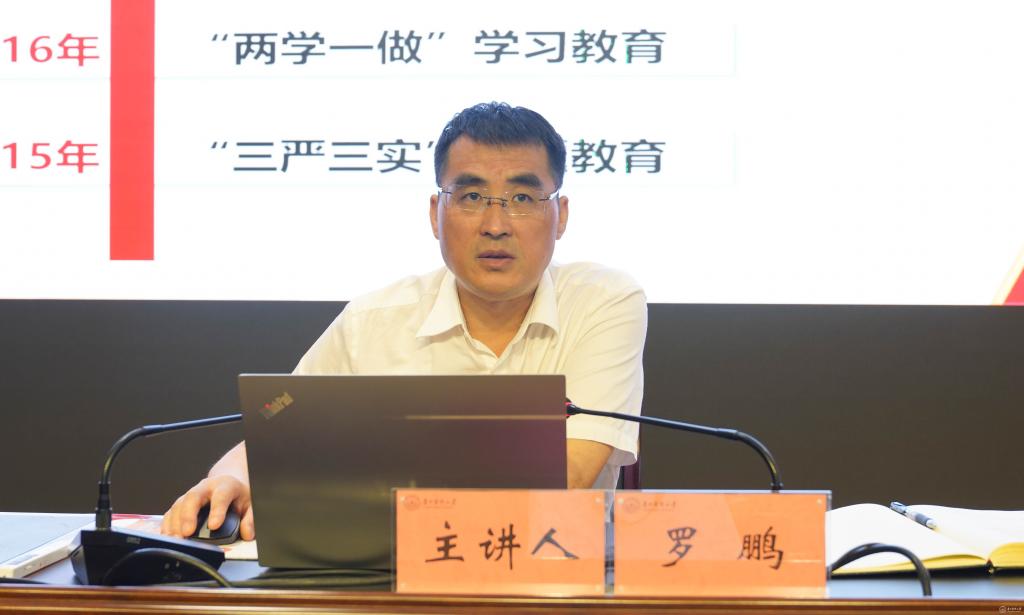 6月29日,校党委副书记、校长,贵州省天然产物研究中心主任罗鹏以“凝心铸魂担使命 踔厉奋发建新功 坚定不移以思想伟力引领学校高质量发展”为贵州省天然产物研究中心及分管联系单位班子成员、党员代表、师生代表作学习贯彻习近平新时代中国特色社会主义思想主题教育专题党课。省委主题教育第十七巡回指导组到会指导。