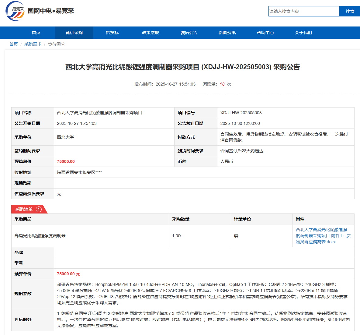 welcome欢迎光临威尼斯集团高消光比铌酸锂强度调制器采购项目(XDJJ-HW-202505003)竞价采购公告