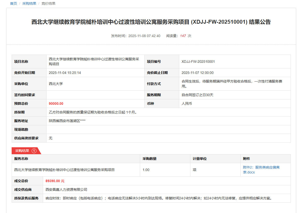 welcome欢迎光临威尼斯集团继续教育学院棫朴培训中心过渡性培训公寓服务采购项目(XDJJ-FW-202510001)竞价结果公告